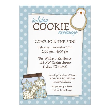 Holiday Cookie Exchange Invitations. Featuring a cute snowman cookie and a jar of cookies on a blue and white polka dot background. Cute and whimsical design for your Christmas cookie swap party!